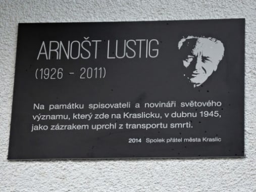 Útěk Arnošta Lustiga z transportu smrti dnes připomíná pamětní deska na nádraží v Kraslicích. Fotografie převzata z Portálu literárních muzeí.